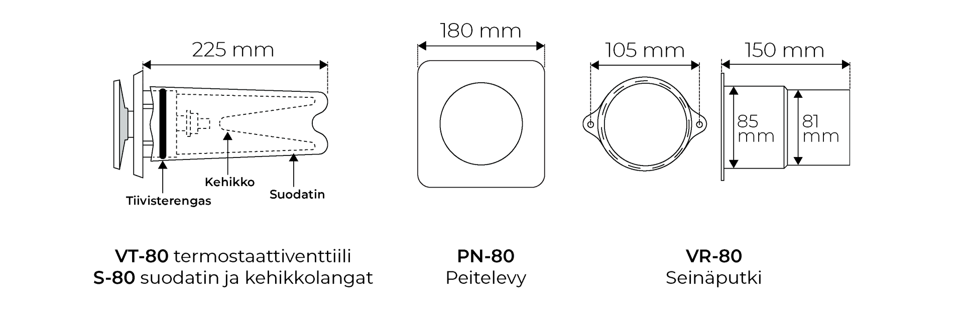 - Olemassa olevaan putkeen asennettaessa pelkkä VT-80 venttiili vaatii n. Ø80 mm.