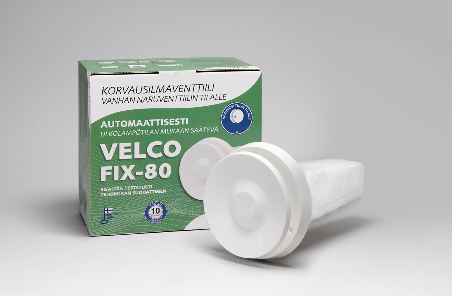 Velco FIX-80 sisältää kaiken tarvittavan asennukseen: automaattisesti ulkolämpötilan mukaan säätyvän Velco VT-80 -korvausilmaventtiilin, tehokkaan Velco S-80 -suodattimen, seinäputket sekä asennuslevyn.