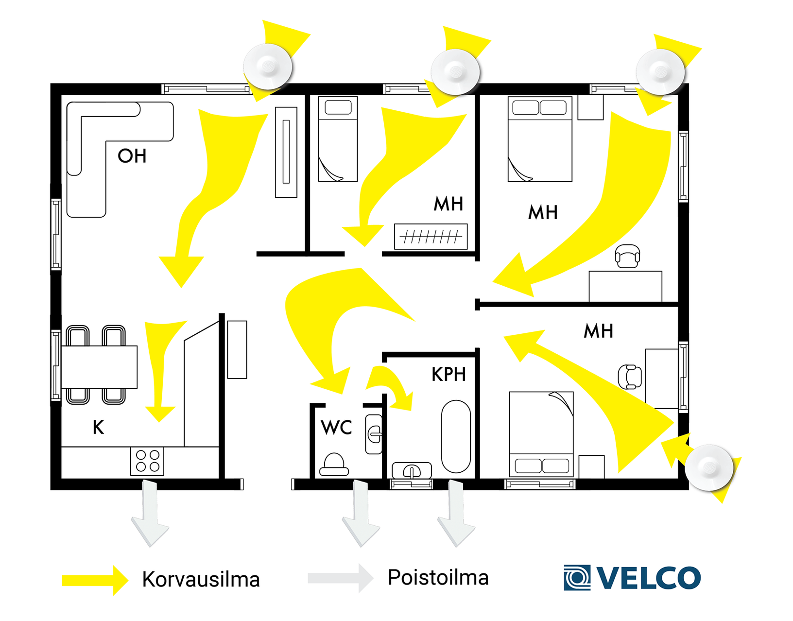 Korvausilmaventtiilien kautta sisään tuleva ilma huuhtelee asuintilat virratessaan kohti keittiössä, WC- ja pesutiloissa sekä vaatehuoneissa sijaitsevia poistoilmaventtiileitä.
